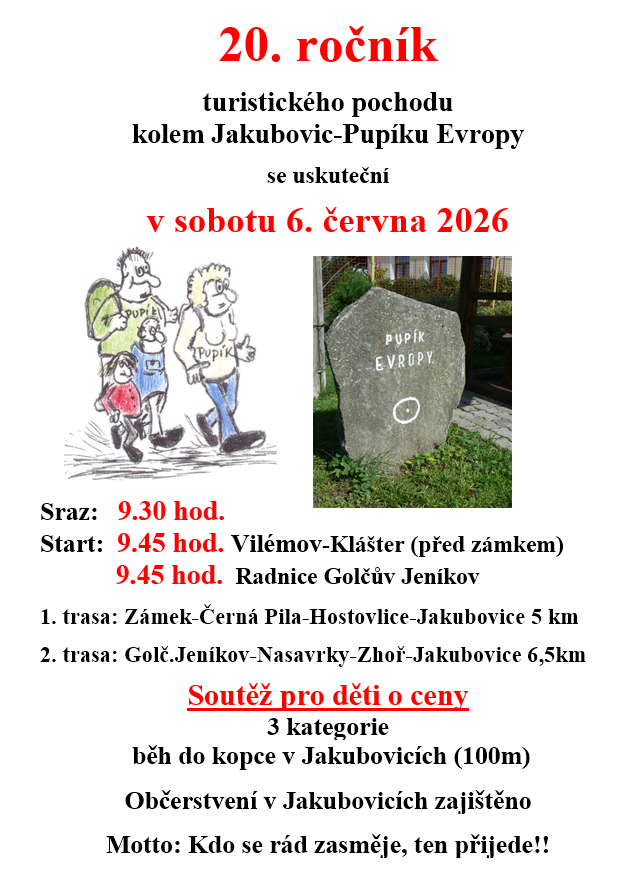 Srdečně Vás zveme na již 20. ročník turistického pochodu kolem Jakubovic - Pupíku Evropy, který se uskuteční v sobotu 6. června 2026. Připraveny jsou soutěže pro děti, občerstvení a spoustu dalšího.