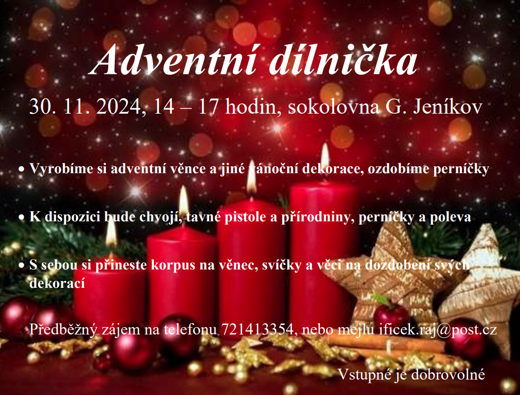 V sobotu 30.11.2024 od 14 do 17 hod. bude v místní sokolovně připravena pro všechny zájemce Adventní dílnička.