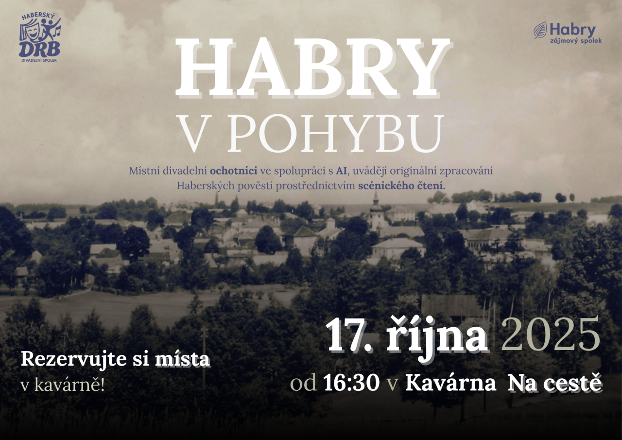Místní divadelní ochotníci ve spolupráci s umělou inteligencí uvádějí originální zpracování Haberských pověstí prostřednictvím scénického čtení. Přijďte si poslechnout místní příběhy a užít si atmosféru v Kavárně Na cestě.