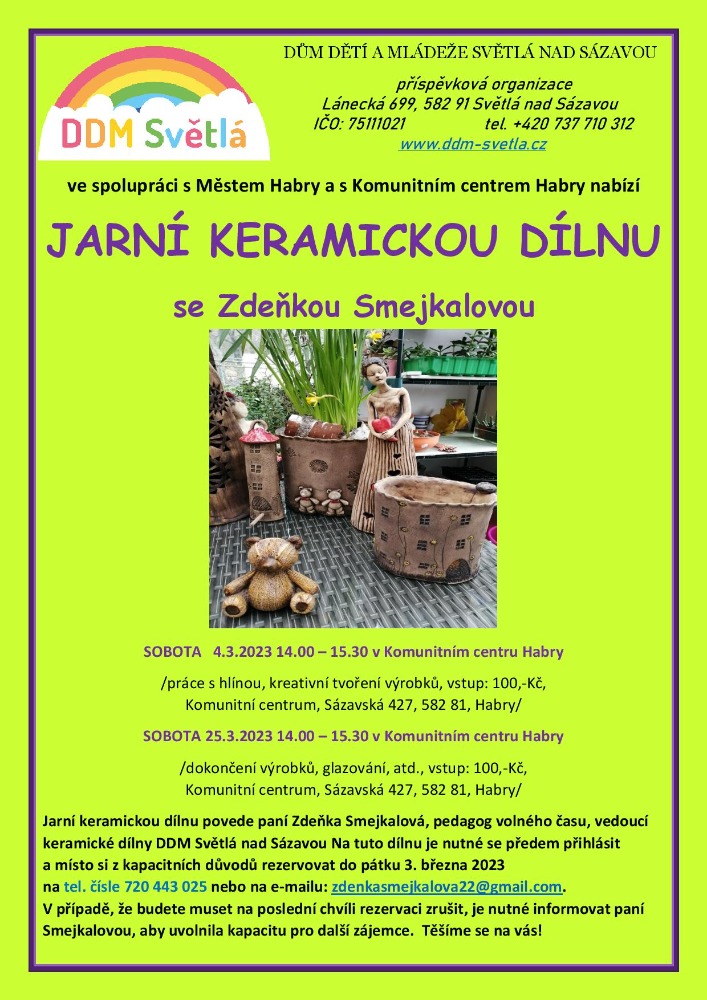 DDM Světlá nad Sázavou ve spolupráci s Městem Habry a s Komunitním centrem Habry nabízí Jarní keramickou dílnu se Zdeňkou Smejkalovou.