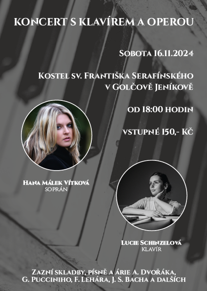 V sobotu 16.11.2024 od 18.00 hod. se v kostele sv. Františka Serafínského v Golčově Jeníkově uskuteční koncert s klavírem a operou. Zazní skladby, písně a árie A. Dvořáka, G. Pucciniho, F. Lehára, J. S. Bacha a dalších.