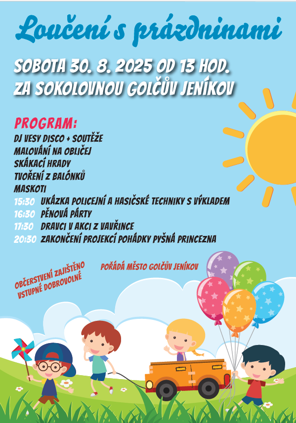 Město Golčův Jeníkov vás srdečně zve na Loučení s prázdninami, které se koná v sobotu 30.8.2025 od 13.00 hodin za sokolovnou.