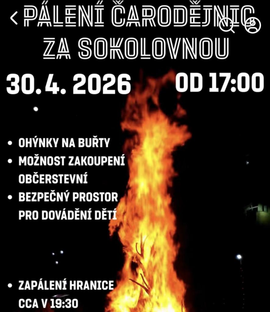 Sokol Golčův Jeníkov Vás srdečně zve na pálení čarodějnic, které se uskuteční 30. dubna 2026 od 17 hodin za sokolovnou. Můžete se těšit na ohýnky na buřty a možnost zakoupení občerstvení. Pro děti je připraven bezpečný prostor pro dovádění. Zapálení hranice proběhne přibližně v 19:30.