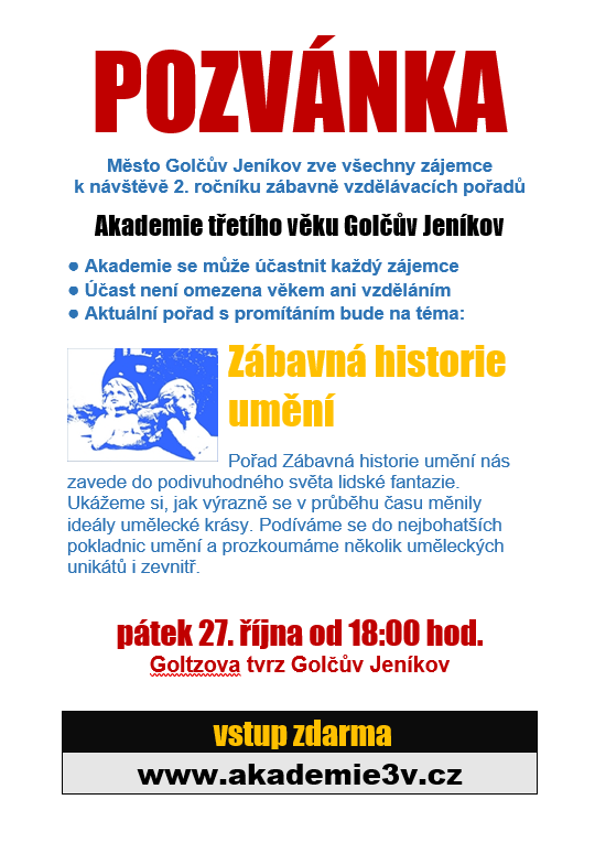 Město Golčův Jeníkov vás zve k návštěvě zábavně vzdělávacího pořadu Zábavná historie umění, který se koná v pátek 27.10.2023 od 18.00 hod. v Goltzově tvrzi.
