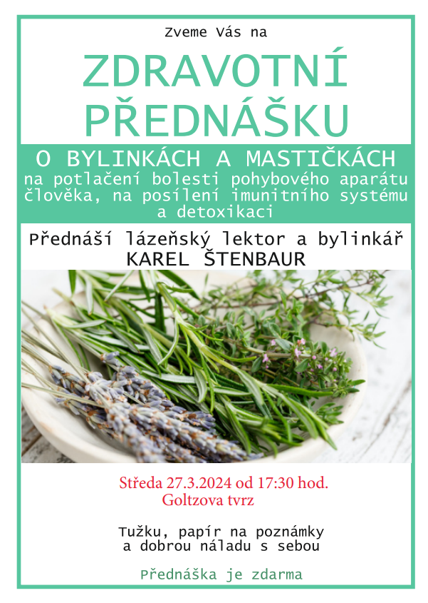 Zveme všechny na přednášku o bylinkách a mastičkách. Přednáší lázeňský lektor a bylinkář Karel Štenbaur.