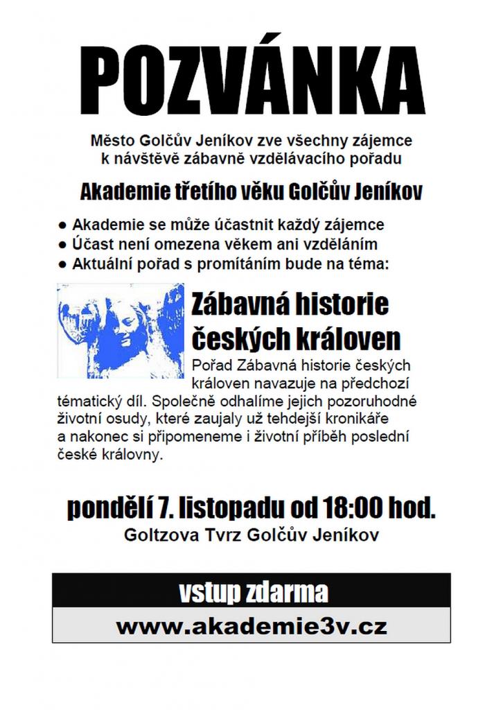 Zábavně vzdělávací přednáška Akademie třetího věku na téma Zábavná historie českých královen - 7. listopadu od 18:00, Goltzova tvrz. Vstup zdarma.