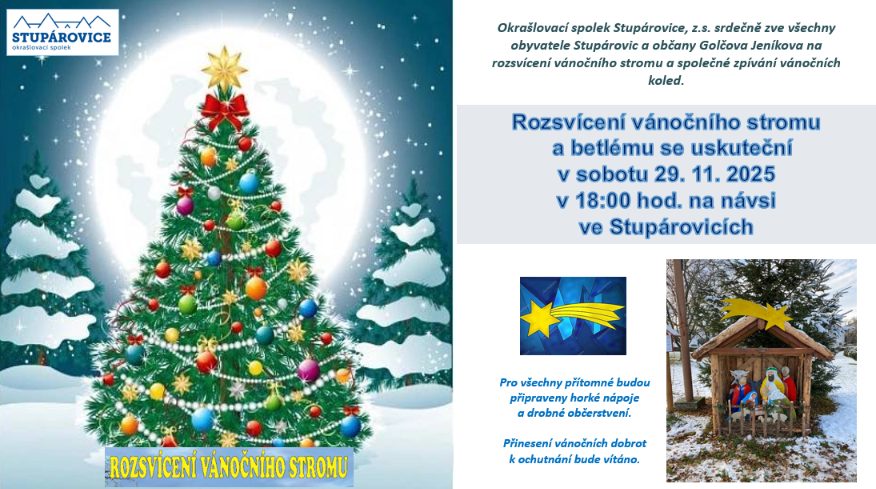Okrašlovací spolek Stupárovice vás srdečně zve na rozsvícení vánočního stromu a společné zpívání koled, které se uskuteční v sobotu 29. listopadu na návsi ve Stupárovicích.