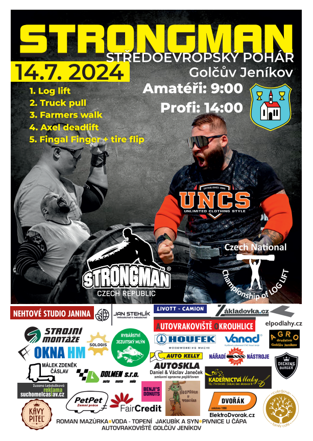 Pořadatel ČNFS a Město Golčův Jeníkov vás zvou na 16. ročník soutěže silných mužů Strongman Czech Republic, která se uskuteční dne 14.7.2024 na Náměstí T. G. Masaryka od 9 hod.