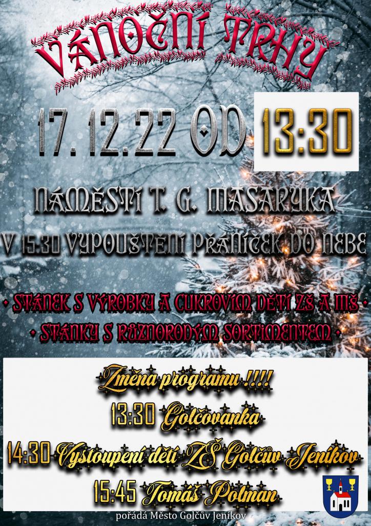 Město Golčův Jeníkov pořádá v sobotu dne 17.12.2022 od 13.30 hod. na Nám. TGM vánoční trhy. Těšit se můžete na výrobky a vánoční cukroví dětí ZŠ a MŠ, vystoupení Golčovanky, dětí jeníkovské pobočky ZUŠ pod vedením Olgy Fialové, vystoupení Tomáše Polmana a vypouštění přáníček Ježíškovi do nebe.