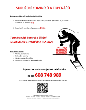 Sdružení kominíků a topenářů bude v úterý dne 3.2. provádět požadované kontroly a čištění komínů pro plyn i tuhá paliva. Čištění komínů nabízí za 550 Kč a revize kotlů na tuhá paliva za 1.300 Kč. Zájemci se mohou objednat telefonicky na čísle 608 748 989.