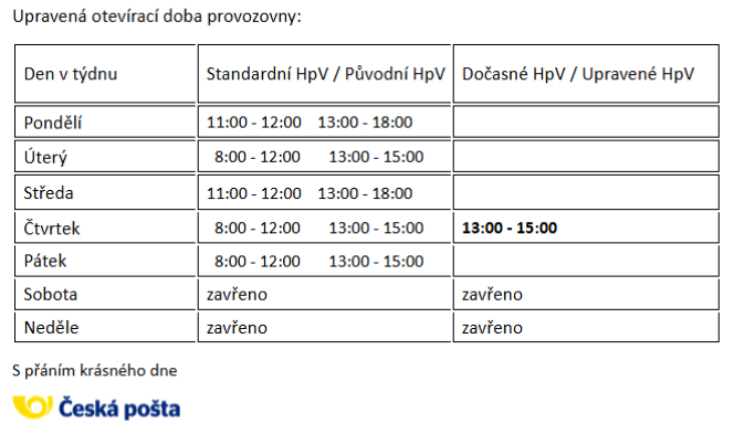 Česká pošta - dočasná změna hodin pro veřejnost 1