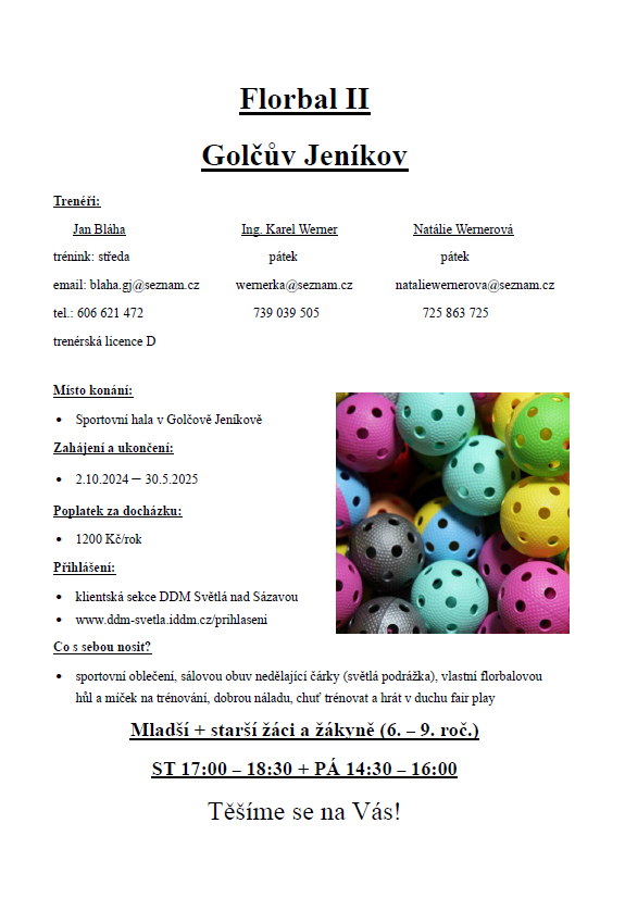 DDM Světlá nad Sázavou, pobočka Golčův Jeníkov nabízí kroužek Florbalu II.