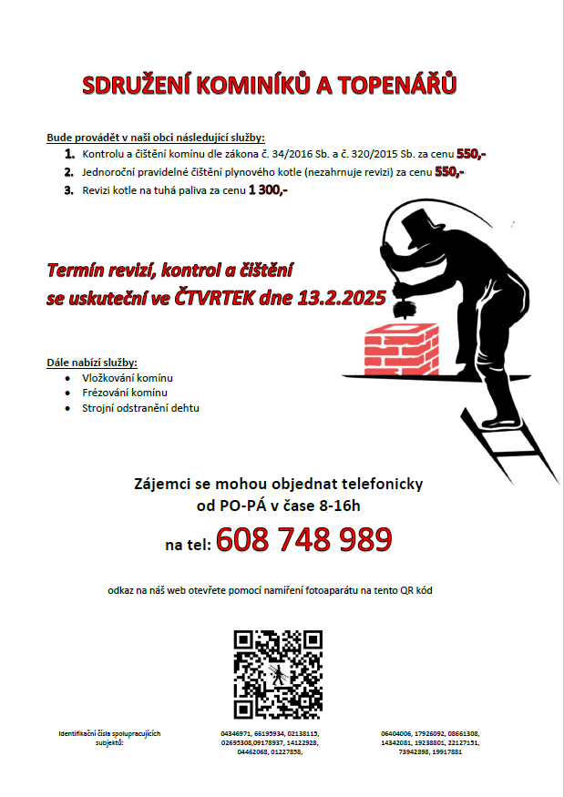 Sdružení kominíků a topenářů bude ve čtvrtek dne 13.2. provádět kontroly a čištění komínů dle zákona č. 34/2016 Sb. a č. 320/2015 Sb. za 550 Kč, jednoroční pravidelné čištění plynových kotlů za 550 Kč a revize kotlů na tuhá paliva za 1.300 Kč. Dále nabízí vložkování a frézování komínů.