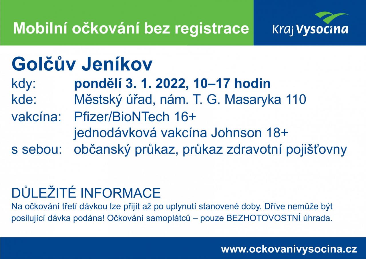 V pondělí 3. ledna je možné v Golčově Jeníkově, Městský úřad, nám. T. G. Masaryka 110 absolvovat očkování bez registrace. Očkovat se bude pro veřejnost v době od 10 - 17 hodin jednodávkovou vakcínou Johnson & Johnson pro osoby starší 18 let. Podány budou i třetí posilující dávky vakcíny Pfizer/BioNTech. Nezapomeňte si s sebou vzít občanský průkaz a průkaz zdravotní pojišťovny. Více informací na www.ockovanivysocina.cz. Stačí jen přijít, veškerou administrativu zařídí pracovníci mobilního očkovacího týmu. Očkování bez registrace bude probíhat v pondělí 3. ledna od 10 - 17 hodin v Golčově Jeníkově.