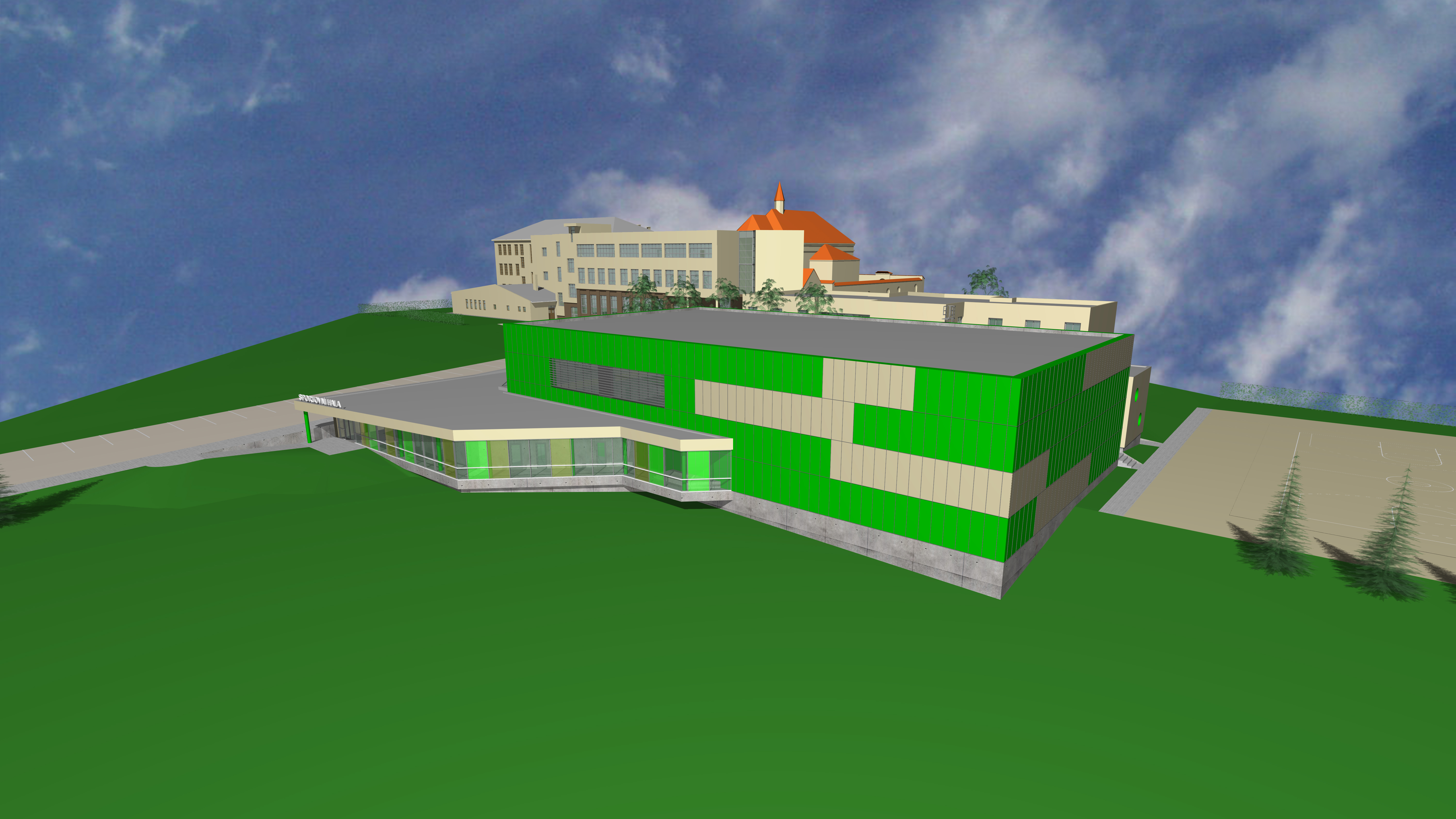 Chceme vybudovat sportovní halu ve školním areálu - předkládáme návrhy projektů, které máme. Protože se jedná o velký finanční objem, je potřeba realizovat dobrý a promyšlený projekt.