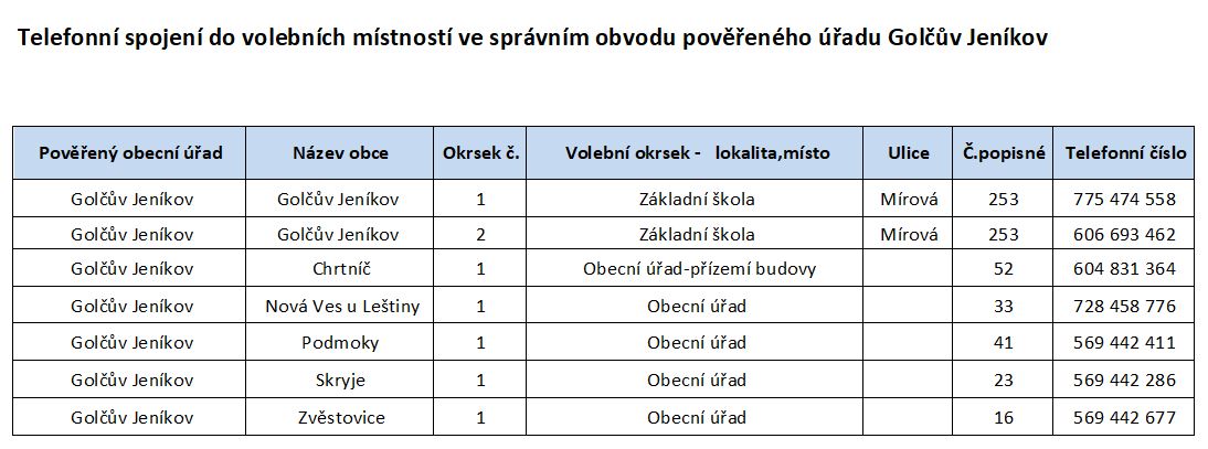 Telefonní spojení do volebních místností ve správním obvodu pověřeného úřadu Golčův Jeníkov