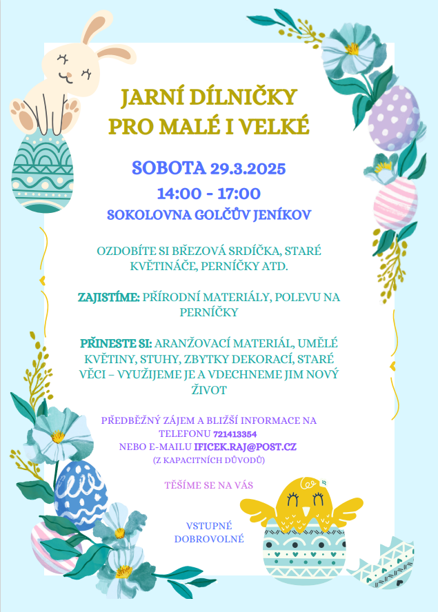 Přijďte si užít jarní dílničky v sokolovně Golčův Jeníkov. Ozdobte březová srdíčka, staré květináče a perníčky. Zajistíme přírodní materiály a polevu na perníčky. Přineste si aranžovací materiál a dekorace, které oživíme!