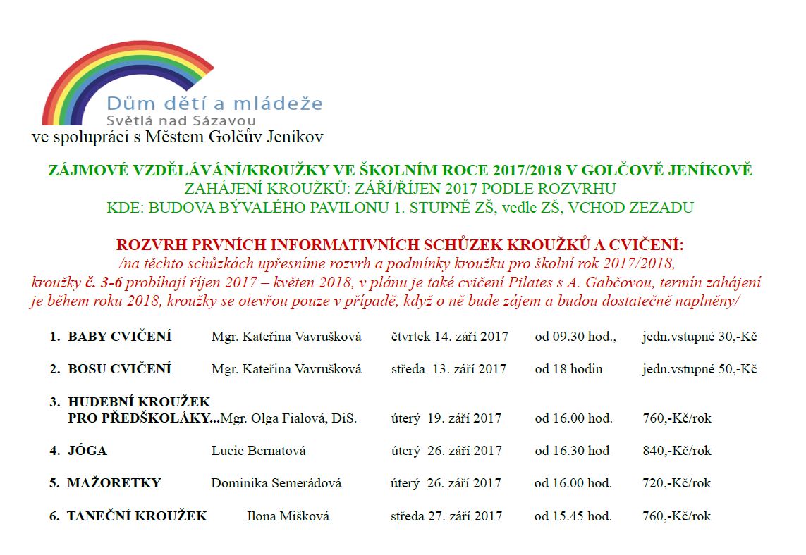 ZÁJMOVÉ VZDĚLÁVÁNÍ/KROUŽKY VE ŠKOLNÍM ROCE 2017/2018 V GOLČOVĚ JENÍKOVĚ. ROZVRH PRVNÍCH INFORMATIVNÍCH SCHŮZEK KROUŽKŮ A CVIČENÍ.
