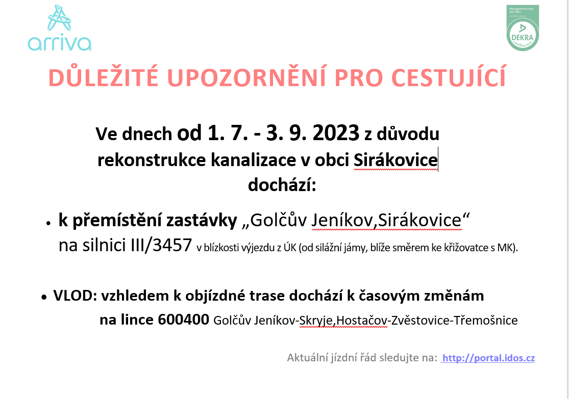Ve dnech od 1.7. - 3.9.2023 z důvodu rekonstrukce kanalizace v obci Sirákovice dochází: