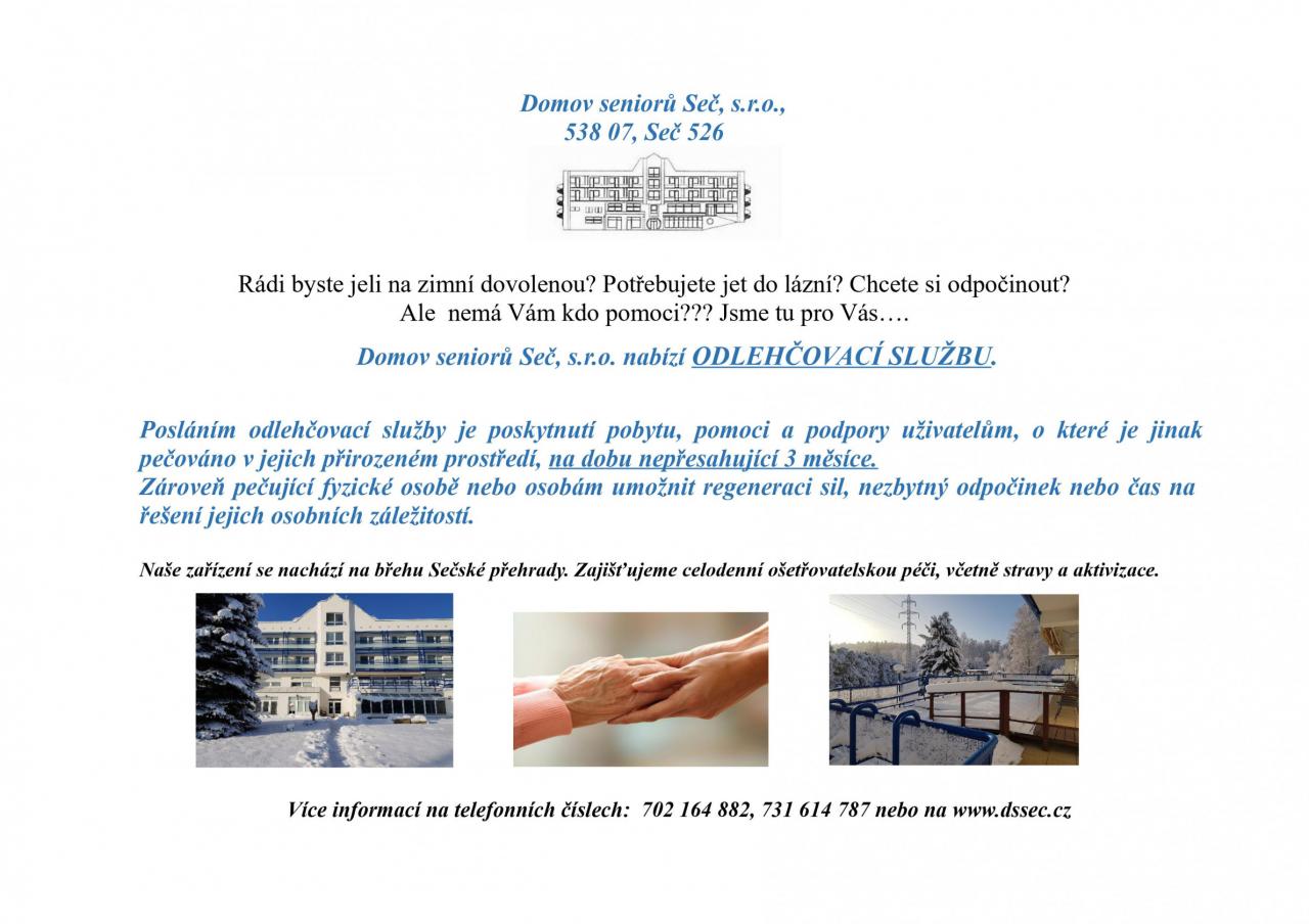 Domov seniorů Seč, s.r.o. nabízí odlehčovací službu. Posláním odlehčovací služby je poskytnutí pobytu, pomoci uživatelům, o které je pečováno v jejich přirozeném prostředí, na dobu nepřekračující 3 měsíce.
