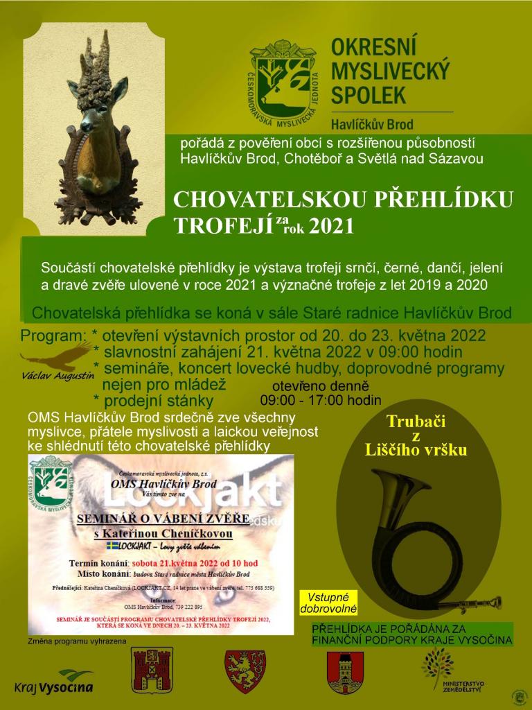 Českomoravská myslivecká jednota, z.s. Okresní myslivecký spolek Havlíčkův Brod pořádá z pověření obcí s rozšířenou působností Havlíčkův Brod, Chotěboř a Světlá nad Sázavou Chovatelskou přehlídku trofejí za rok 2021.